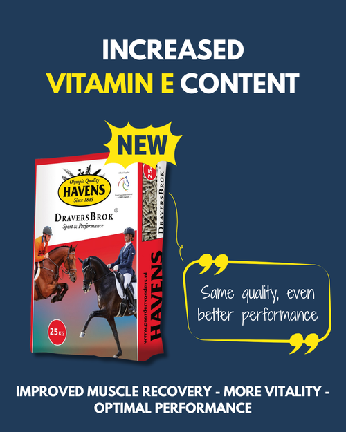 Vitamin E is a powerful antioxidant that helps protect muscle cells against oxidative stress. Especially for sport horses that train intensively or compete regularly, the demand for Vitamin E is significantly higher. By increasing the level, the renewed DraversBrok provides even more support for optimal performance and faster recovery after exercise.
